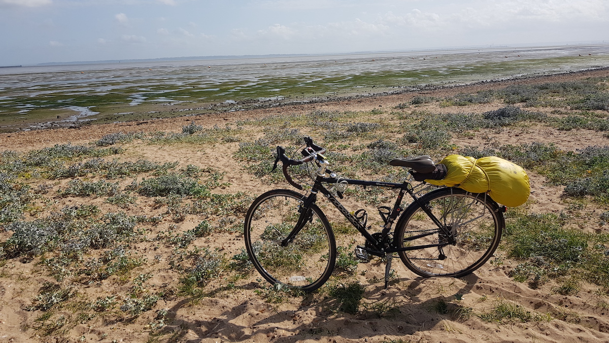 Made it! Philip's bike on the sweeping sands of the Thames estuary at Shoeburyness