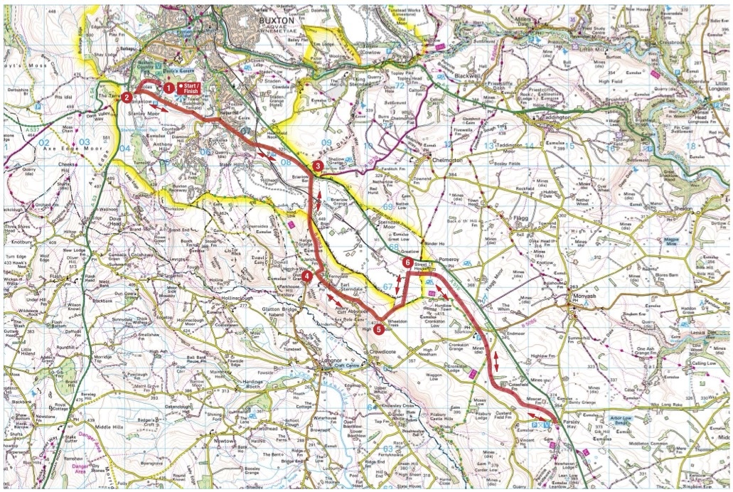 1. From Buxton Club Campsite cycle through the country park to reach Grin Low Road. Turn left and continue to a T-junction.