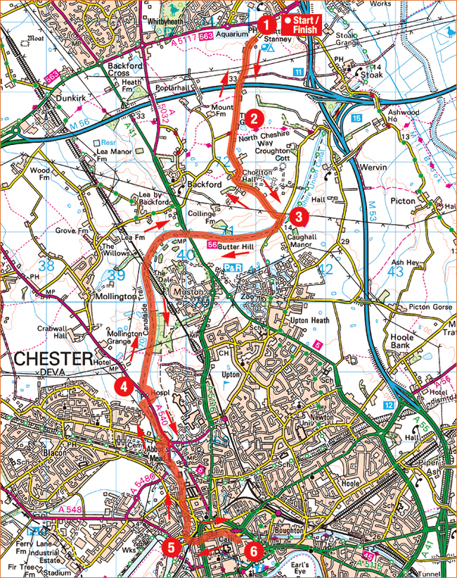 5. 9.7km – At the canal basin, with the Canal Warehouse Workshop opposite, cross the canal on the narrow, white footbridge and continue following the canal, which is now on the left, to climb alongside Northgate Locks. Stay by the canal, with towering walls either side, to reach the waterside Lock Keeper pub. Just before the pub take the path on the right to a roundabout. Take the second exit (Frodsham Street) and from here Chester Cathedral is on the right.