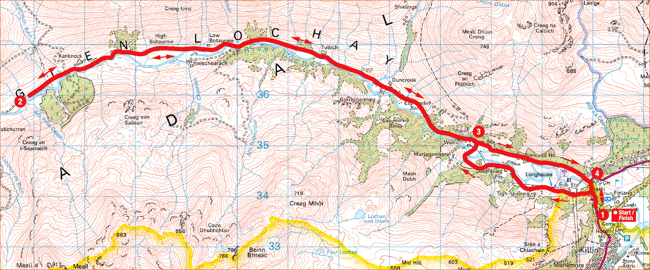 1. From Maragowan Killin Club Campsite turn right along the A827, and in 450m turn left, signposted to Moirlanich Longhouse. Continue on this road, crossing the river after about 3km, and keep heading up the valley for a further 9km until the asphalt gives way to rough gravel.