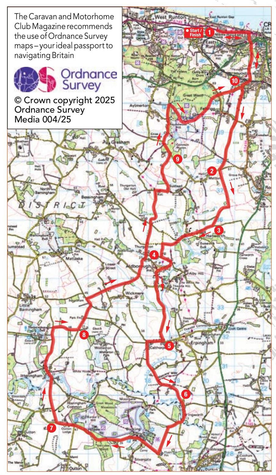 10. 40.4km – Turn left at the junction to Cromer (retracing the outward journey) to reach a crossroads. Go straight ahead, and over the next two crossroads to reach the coast road. Turn left and stay on this road for 1.1km to reach Seacroft on the left.