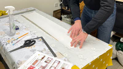 I spend several minutes manoeuvring the fabric up and down over the self-adhesive panel that will form the inside of the lampshade. The panel acts a little like a picture frame, determining which elements of the pattern will be visible. Once I’m happy, I pin the fabric to the panel, and with Lee’s guidance and Vernon Kay’s ‘Ten to the Top’ in the background, I peel back adhesive film and stick down the fabric, advancing just three to four centimetres at a time. “Now mark a perimeter of 1.5cm in pencil, add two ears at one end, and cut the fabric,” says Lee. The ‘ears’ are two small flaps that will neatly fold into the shade’s hem to stop the fabric fraying at the seam. I meticulously measure and draw them, before accidentally cutting one straight off.