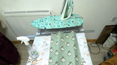 Fortunately, it’s straightforward to apply double-sided tape to the edges of the fabric and to the two rings that will form the top and bottom of the shade. I had wondered how the fabric would be pulled taut, but it turns out that there’s no technique beyond ironing it at the start of the day. The shade takes shape simply by rolling both rings at the same time along the upper and lower edges of the material, leaving a hem of just over a centimetre. The tape holds firm, and in barely 90 seconds the drum of the lampshade is complete.
