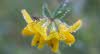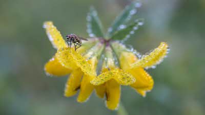A flower of bird’s-foot trefoil is enhanced by dew