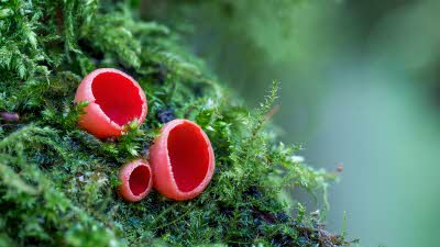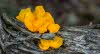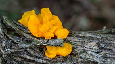Among the moss-covered twigs and branches at the damp edge of the wood I found a bigger burst of red: scarlet elf cups. These fungi, each about the size of a penny, are quite sufficiently described by their name. There’s another even more peculiar and equally colourful fungus: the yellow brain fungus. This grows on the gnarled, old stems of gorse bushes, and has a jelly-like structure with folds and lobes that loosely resemble the shape of a brain.