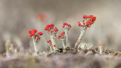 As the frost yielded, its melting crystals revealed small patches of colour on the ground. A huge variety of lichens grows around the base of heather, creating a world in miniature. My favourite is the matchstick lichen, a distinctive red-capped species. Though tiny in size, it adds a welcome vibrancy on a cold day.