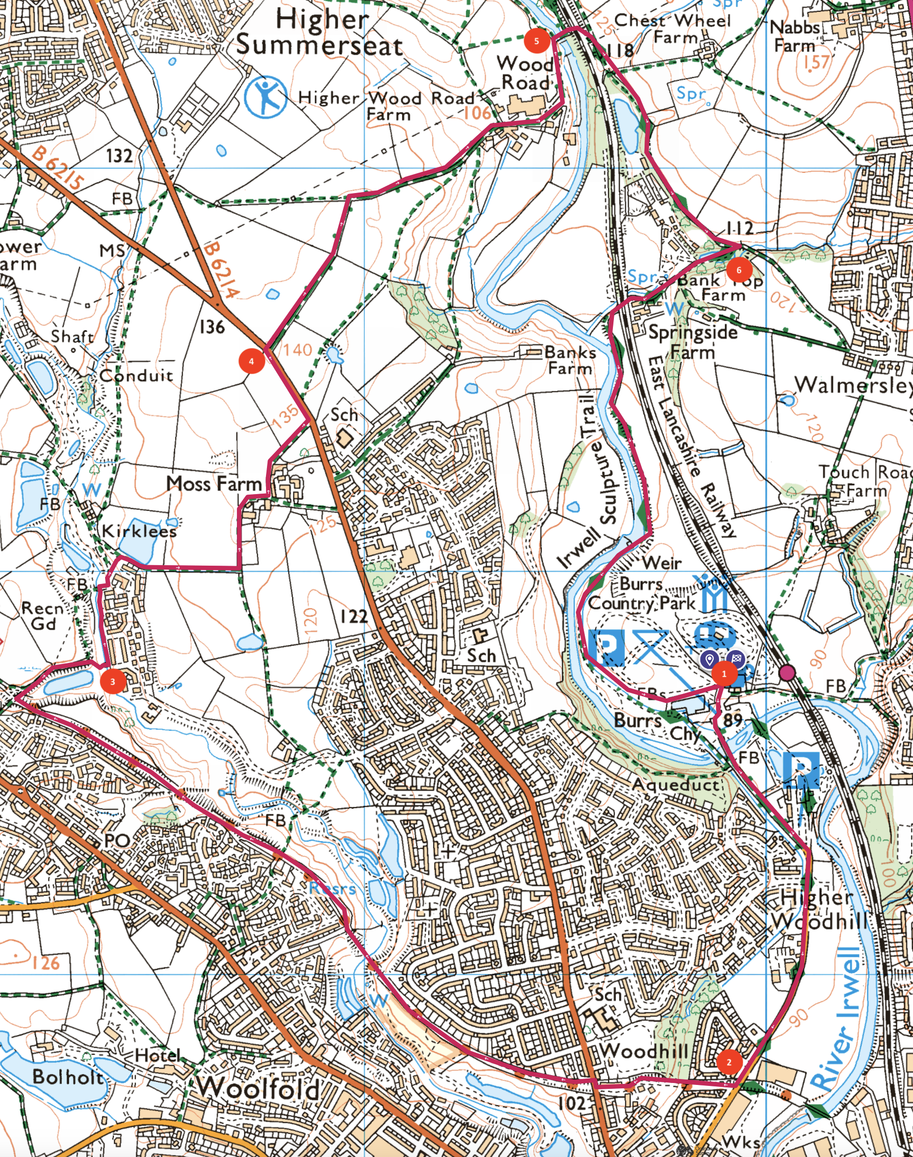 5. 6km – To continue, cross the bridge over the river and take steps up the steep banking to cross the East Lancashire Railway line and join the Irwell Sculpture Trail heading right. Continue right through the gate along the edge of woodland for 500m to reach the gate leading into a lane. Head sharp right down lane signposted Burrs Country Park.