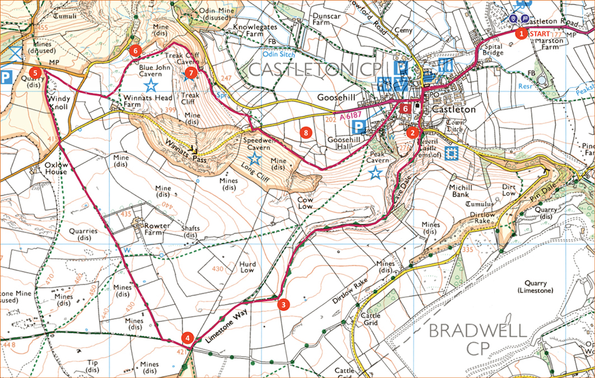 1. From the site gate, cross the road with care and head left on pavement into the village. In the centre of the village, at the Nag’s Head, head left along Back Street, towards Peveril Castle. Continue across the old Market Place, keeping left then taking the footpath signposted Cave Dale.