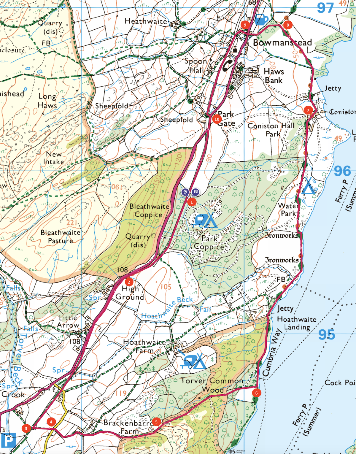 7. 5.1km – At Coniston Old Hall, continue on a road around Sailing Club Bay and fork right at a gate by a barn. Continue on a gravel track through the next gate, heading towards Coniston village.