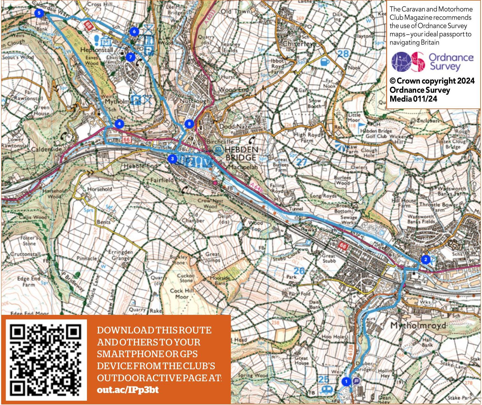 1. From the main gate of the Club site, turn left along a pavement, heading downhill for a mile into Mytholmroyd. Go under the railway bridge and over the River Calder. At the main road, cross with care and head right then left along Midgley Road and take the steps down onto the Rochdale Canal towpath.