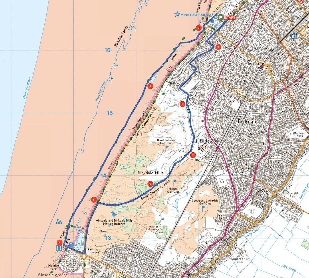 4. 4.5km – At the public toilets, head left along a road and cross a roundabout and the coastal road, then head left along the pavement towards Southport. After 300m veer right, away from the road and continue along the fence for another 250m.