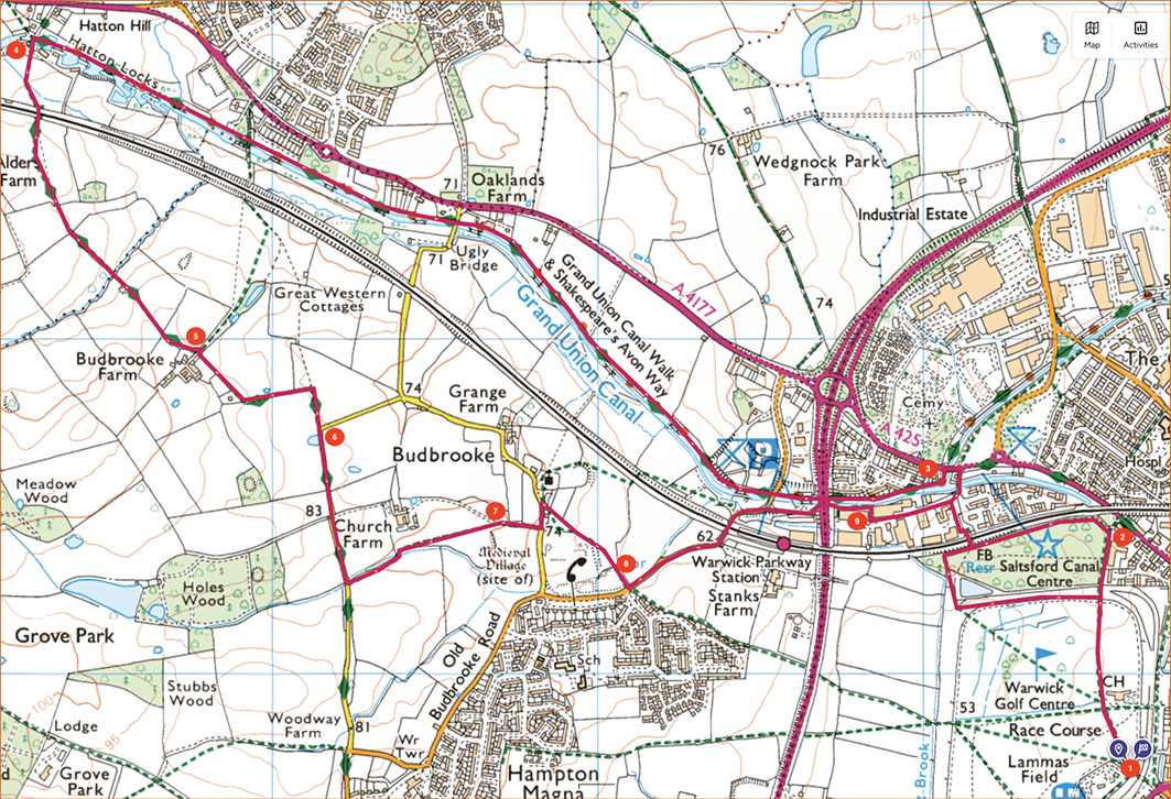 8. 7.9km – Continue through the scrub to Old Budbrooke Road and head left along the pavement under a bridge and past Warwick Parkway Station, then immediately right down an access road and left onto the canal towpath under the A46.