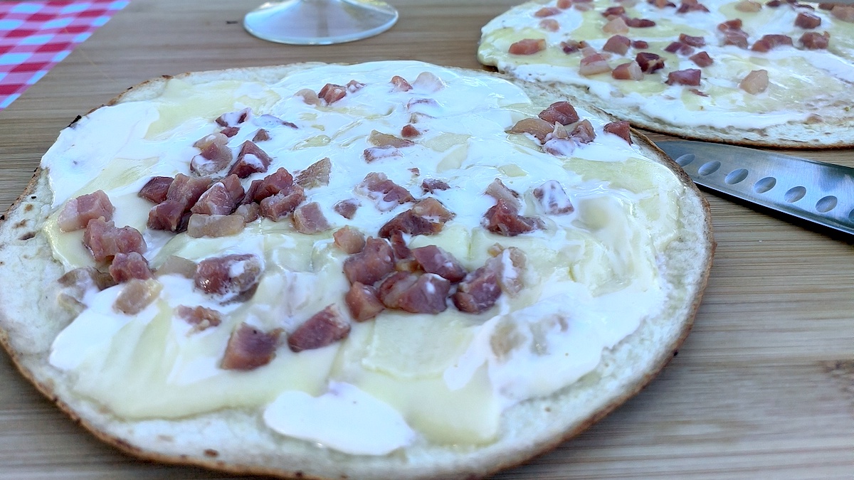 The French version of pizza, tarte flambée is very popular in the Alsace region although you can find it in the chiller cabinets of supermarkets all over the country. Normally it is an unleavened bread base, topped with Emmental cheese, lardons and crème fraîche and oven baked. For my cheats version I used a tortilla wrap which is toasted gently in a frying pan. So crisp and scrumptious!