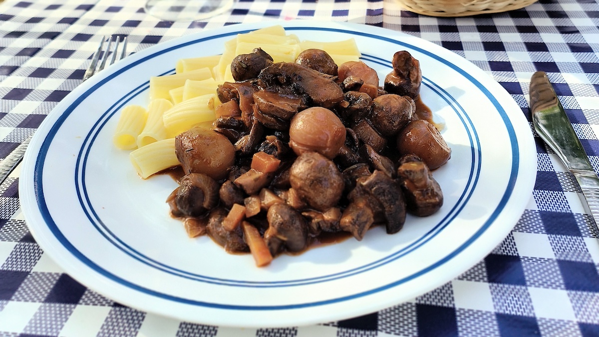 Beef Bourguignon is my signature dish! I developed my version after living on a campsite in Burgundy for six months and sampling the ‘real thing’ in the campsite restaurant many times. A beef version takes many hours to simmer and become tender and delicious, so I have created this mushroom version, which also happens to be accidentally vegan!