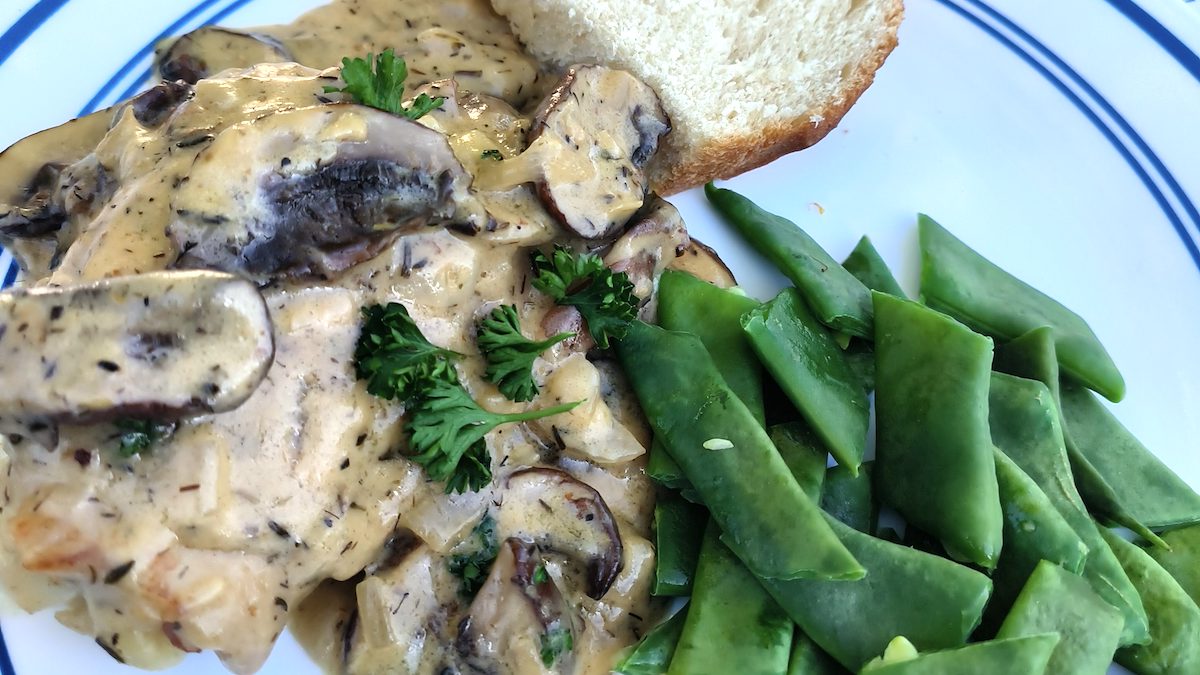 Like chicken chasseur, this is the Alsace version. Made with Riesling white wine, mushrooms and cream. Generally, the chicken is cooked with skin and on the bone but to make it more campsite friendly here I used boneless and skinless chicken thighs, if you can't find that in the French supermarkets you can use chicken breast. For browning the chicken, you can give it a quick burst on the gas BBQ if you have one, otherwise just do it in the pan as it says in the method. If you can't get Riesling any dry white wine will do fine.