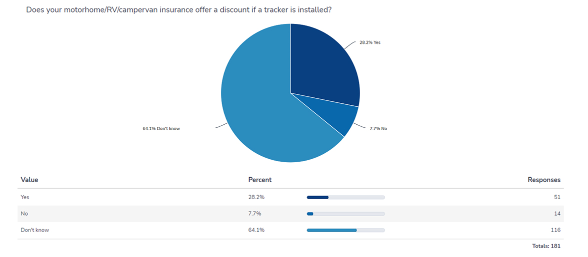 Although some motorhome or campervan insurance policies do offer a discount depending on your security devices, 64% of the respondents from our poll said that they didn’t know if their insurer offered a discount if a tracker was installed. It’s always worth checking with your insurance provider, as well as their competitors, to make sure you can take advantage of any discounts offered.