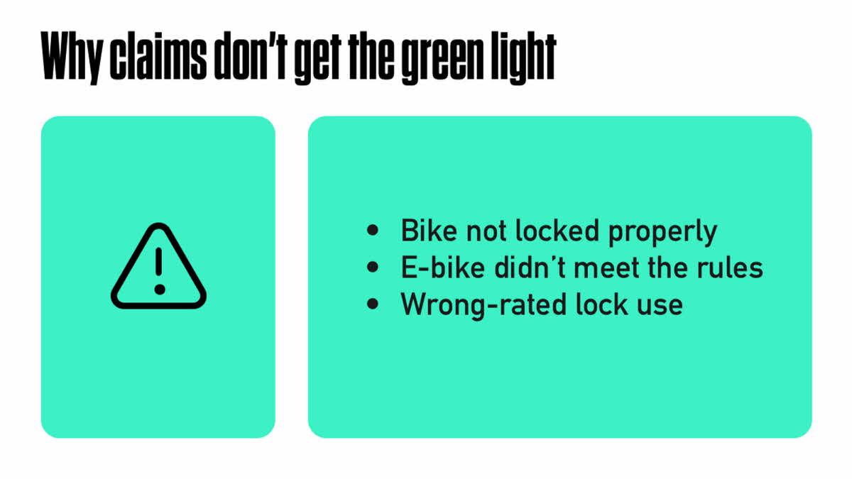 If you’re using a £5 cable lock from a discount site, you’re taking a big risk. We require the use of a Sold Secure Gold-rated lock and that your bike is secured through the frame to an immovable object. Investing in a solid lock and following these requirements will give you peace of mind knowing your bike is covered.