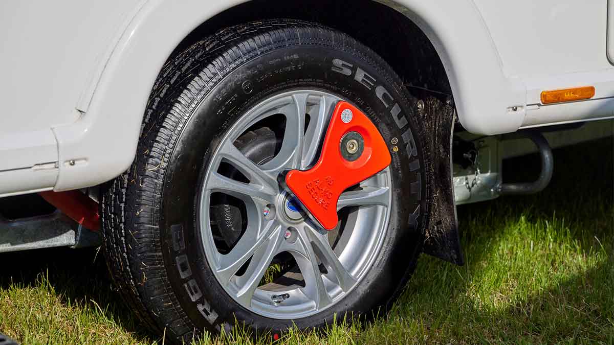 As the name suggests, these lock the wheel to the axle, preventing it from rotating. They’re probably the most effective way of immobilising a caravan, and require serious tools to get them off, as well as increasing the risk of peripheral damage. It is quite straightforward to use wheel locks on a single axle caravan, but can be a bit challenging to fit to both axles on a twin, which your cover provider may require.