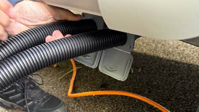Now move on to the water system. Position the waste water container and connect the drain hoses, ensuring they’re firmly attached to prevent leaks. Then, fill your fresh water container and connect it to the caravan’s water inlet. Inside, check that the water heater drain-down valve is closed — this is usually found in a seat locker beside the water heater, and may be yellow or blue depending on your caravan make.