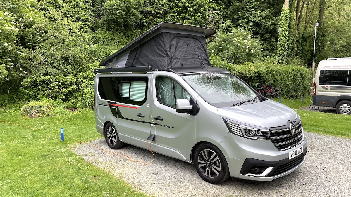There’s quite a bit that sets the Adria Active Duo apart from the rest of the campervan world. For starters, and somewhat unusually, the base vehicle is Renault’s latest Trafic. My review vehicle is fitted with a whole host of optional extras – the £2,095 Comfort Pack, for example, includes the elevating roof, leisure battery, cab carpet, wind-out awning and Webasto heating, plus revised suspension that lowers overall height to a car park barrier-beating 1.99m.
