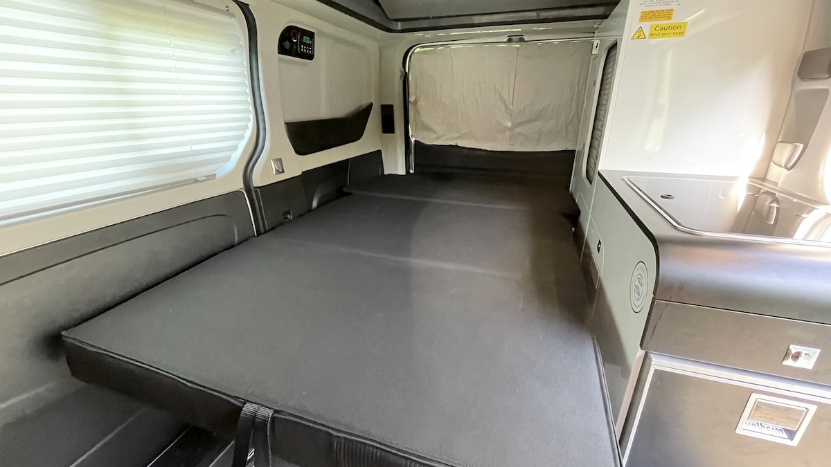 As is typical for a campervan, there are two lots of beds. The Reimo seat unit converts easily enough into a 1.90m (6ft 3in) x 1.10m (3ft 7in) double by pulling the seat squab out then hinging it over and letting the backrest drop into the space it creates. There’s still a decent amount of all-important floor space once it’s in place.