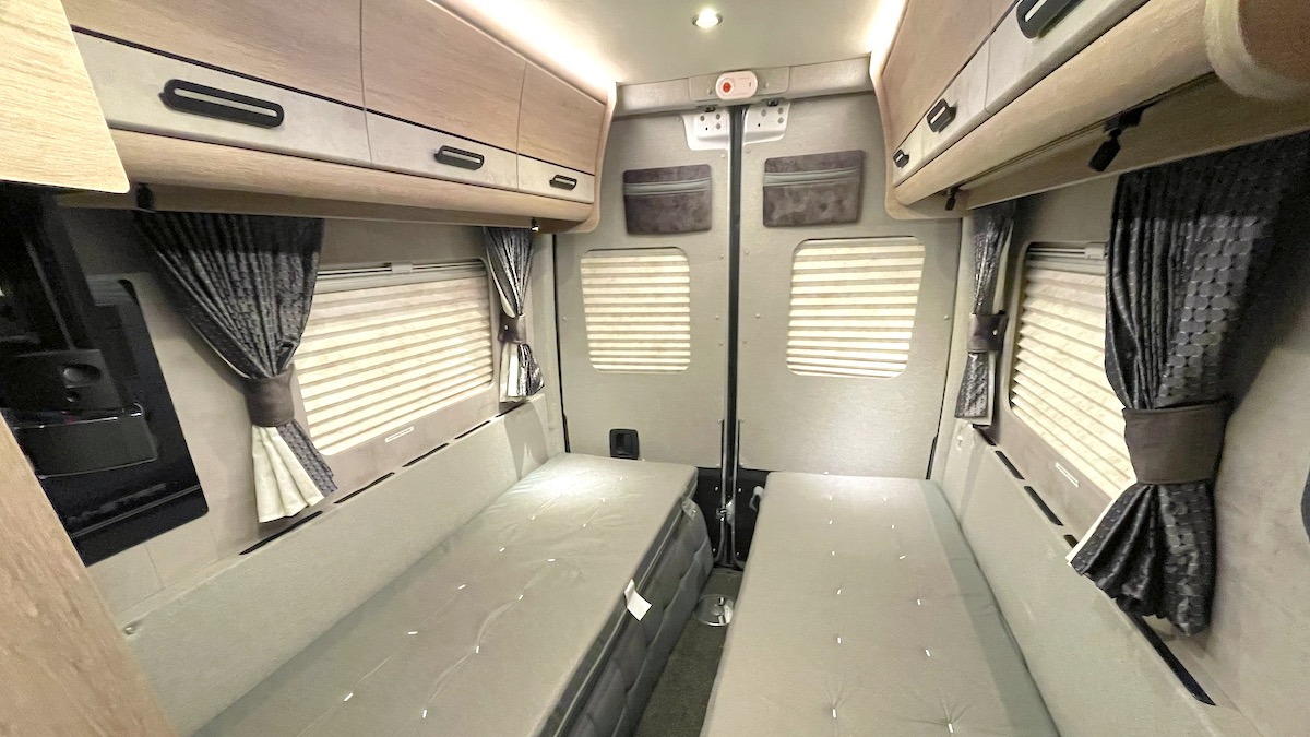 If you’re used to a Fiat- or Peugeot-based van conversion, you’ll notice the interior of the Mercedes is that bit narrower, and there’s more tumblehome (the upper curve of the bodywork), although Auto-Sleepers overcomes the effect of this with a concave shape to the high-level lockers.