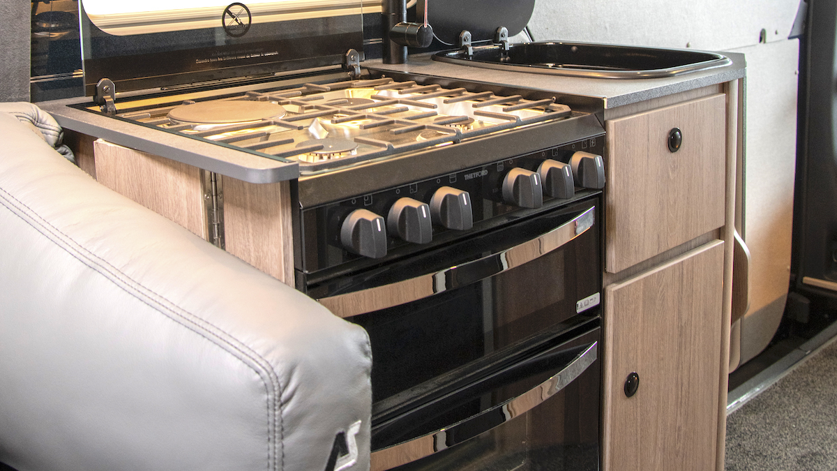 There’s a Thetford cooker with separate oven and grill and a hob that includes an electric hotplate and a cast-iron grid. Other fittings include an extractor unit with lights and a black acrylic splash panel. Storage provision includes two overhead lockers and two adjacent to the cooker, the lower of which also has a small, slide-out cutlery tray.