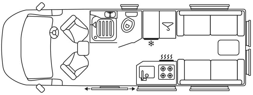 You might recognise the floorplan from one of Auto-Sleepers’ favourite models of recent years – the Boxer-based Warwick XL. It features twin settees facing each other at the rear which, in turn, can be made into single beds or a double. In daytime mode, there’s a single point to take a pedestal leg and tabletop, the latter being rather small, even for two folk.