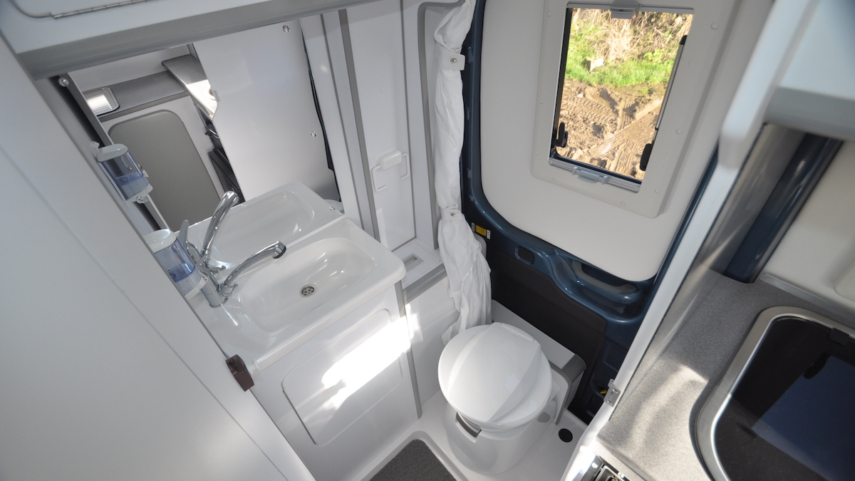 The basin and shower tray are in GRP (much tougher than the usual, often flimsy, plastic) to Murvi’s own designs and there’s good upper- and lower-level locker storage. An opening window in the rear offside door takes care of ventilation, plus there’s a rooflight above. Opening the door gives instant, easy access to the toilet’s holding tank.