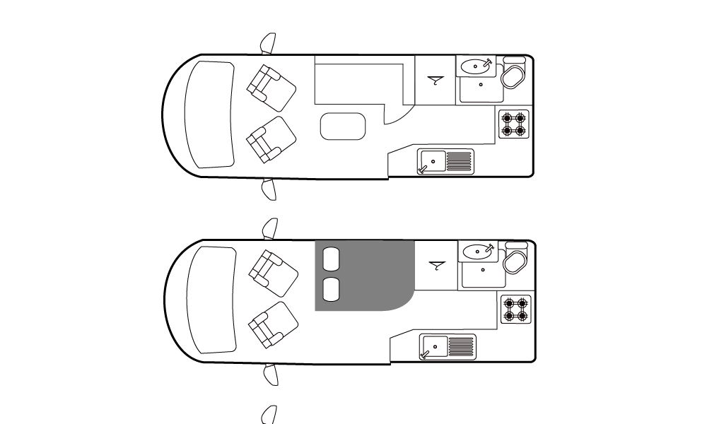 Most folk will already have the cab seats swivelled, which can give you a bit of extra bed length, but an alternative is to keep them forward-facing and use them as backrests if you want to sit upright in bed. That would be perfect for watching a TV (optional) mounted on the bulkhead behind the rear seat.