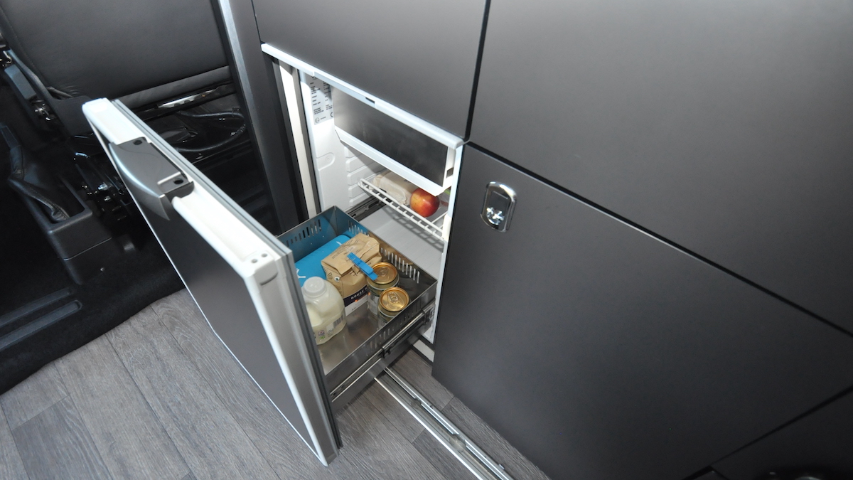 There’s a typical campervan set-up in the kitchen with a combined two-burner hob and sink complemented by a 42-litre drawer-style compressor fridge.