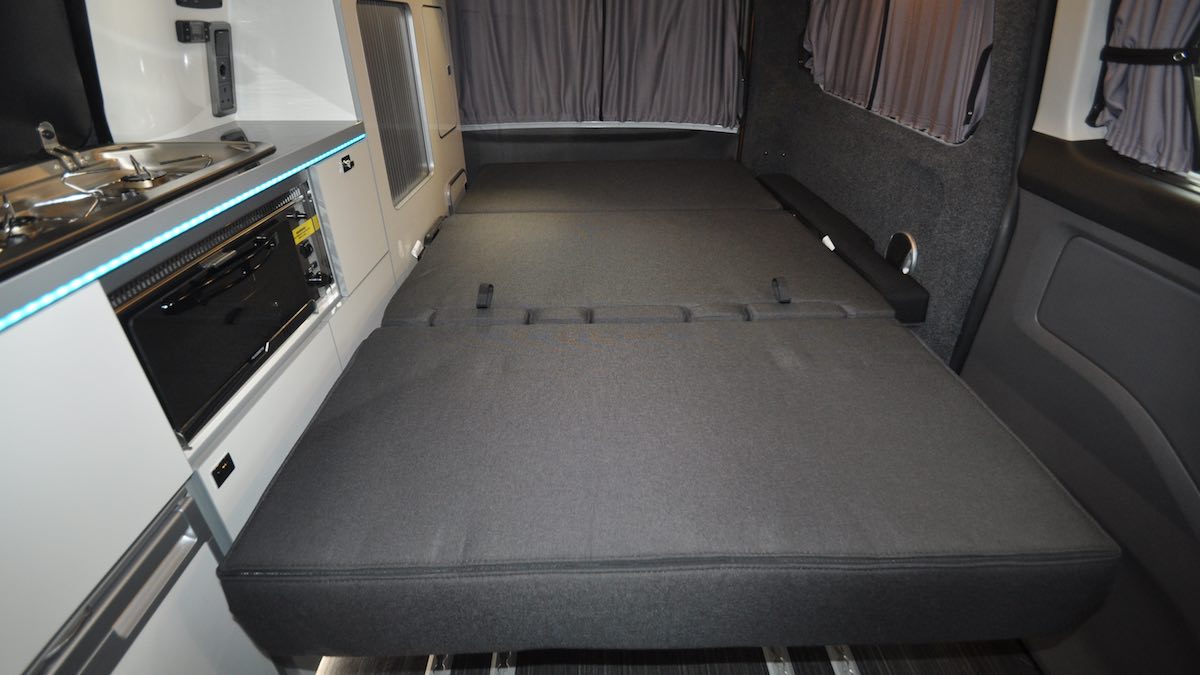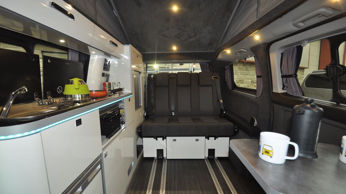 Quality conversion elements are also in evidence, exemplified by a sliding rear seat with three integral three-point belts, from German company Schnierle. The pop-top is from UK company Drivelodge, which has a decades-long history of camper roof production. It’s particularly easy to use, with an acrylic window at the front and mesh screens each side. Keeping the solid section of the roof in black is a cost-saver, but it blends in particularly well here.