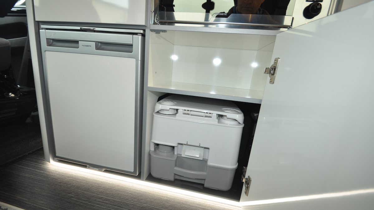 The portable toilet is all you get in terms of washroom facilities, although an exterior shower fitting is an optional extra. A neat touch is the facility to remove the toilet for emptying via the offside sliding door (it saves dragging it through the van’s interior).