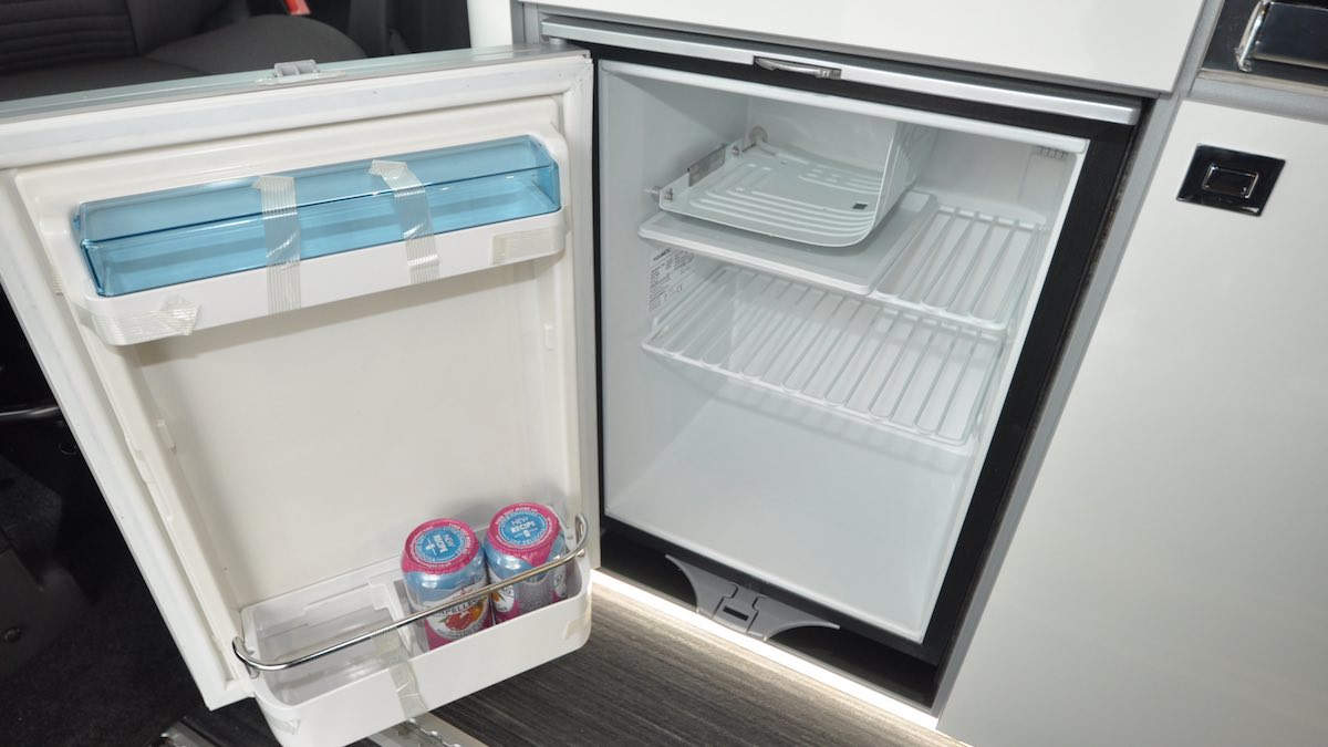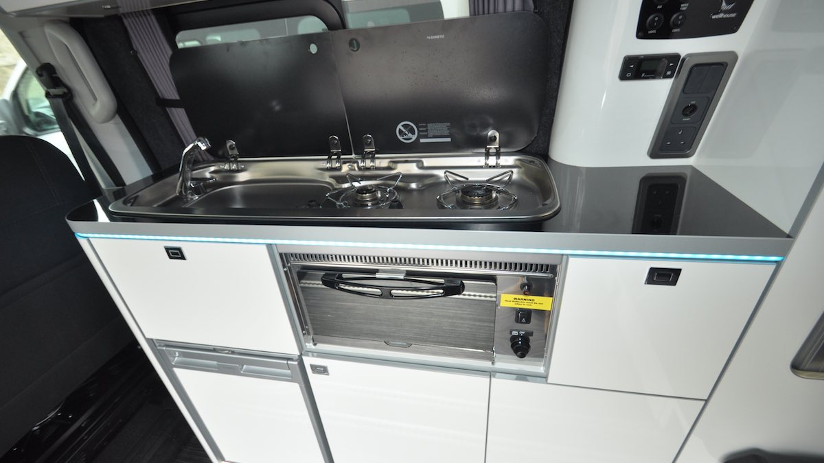There’s the de rigueur two-ring gas hob and sink combination here under smoked glass lids, along with a Dometic compressor fridge,