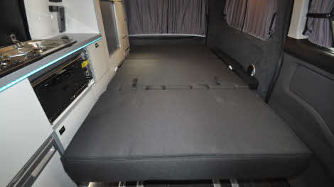 Without doubt the main bed will be downstairs, where you need to bring the seat base forward before folding out flat its three sections. Extra width is provided by a padded section along the nearside. There’s a knack to operating the retainer catches for the seat base but otherwise bed make-up is a straightforward enough operation.