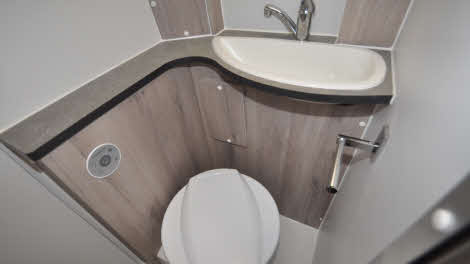 There’s a space-saving tambour-door entrance to the washroom, where WildAx has squeezed in a Dometic swivel-bowl toilet, a shower on a riser bar and a fixed basin, the latter set in front of an illuminated alcove.