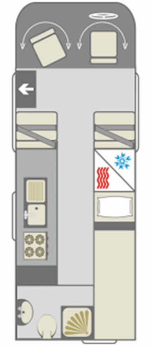 The main bed, though, is the transverse double made up from all the lounge seating (but not the swivelled cab seats). There’s some metal framework to drop in after you’ve folded the two rear seats flat. It’s a decent enough size, at 5ft 11in x 4ft 3in but, of course, it cuts across the sliding door. I would consider a mattress topper if you want a softer sleeping surface.
