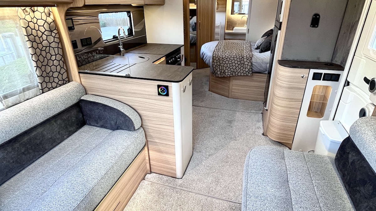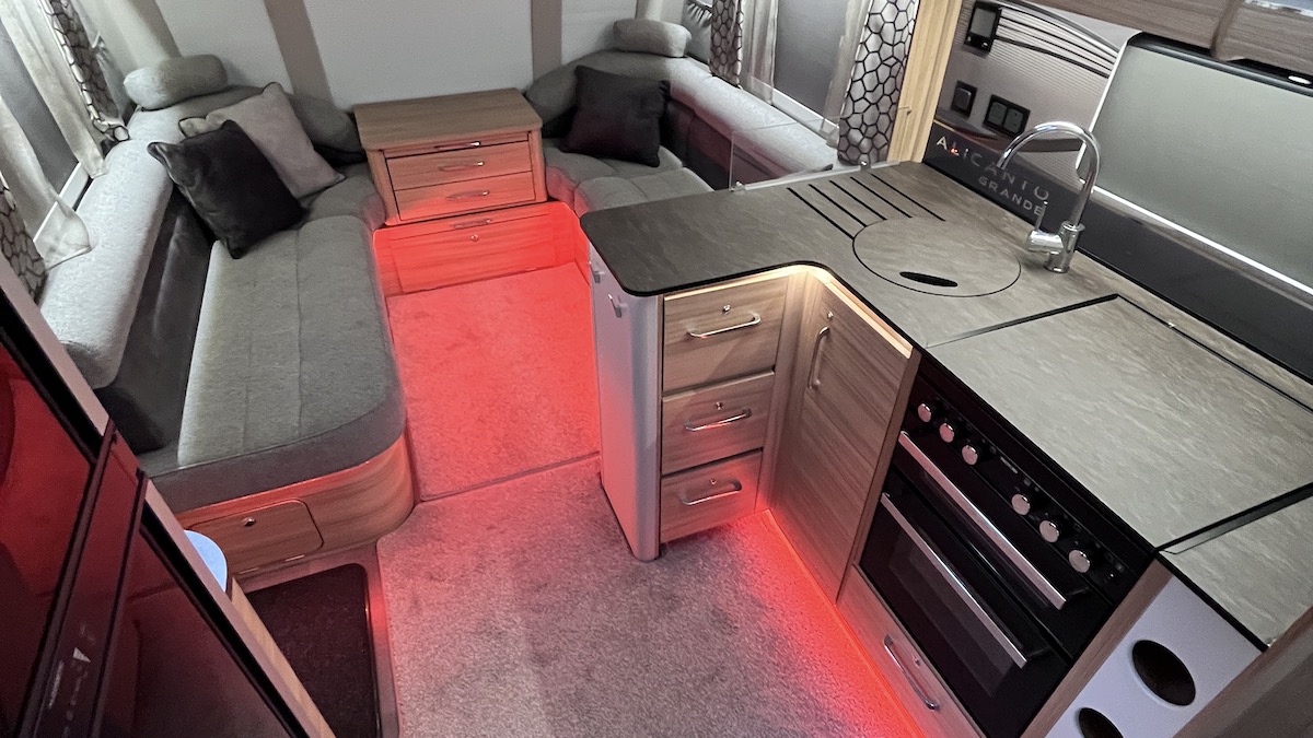 In a recent test, I gave the Coachman Acadia my unofficial award for the most lighting permutations in a caravan. Well, scratch that. The Alicanto has a touchscreen unit on the side of the kitchen unit, operable from the lounge, that offers thousands of options. It controls the colour of the low-level ambient lighting that runs under the lounge seating and just above floor level in the kitchen – and it’s a dimmer control too, adding even more permutations. What a fun bit of kit!