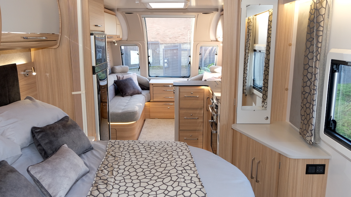 This is a huge caravan in every respect. It is, of course, 8ft wide – and I’ve mentioned in previous reviews the compromises involved in towing such a beast around the UK’s busy and sometimes narrow roads. It’s also a giddy 25ft 10in long and weighs nearly 1.7 tonnes before you even think about packing. These stats need to be factored into any buying decision – but they’re clearly no barrier to sales success, as this model’s performance at the NEC show proves.