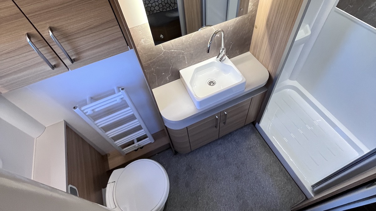 Ladder-style radiator? Check. Wash basin lifted straight from a Sunday-supplement hotel? Oh yes. And the marbled-tile-effect wall panels above the basin and in the shower are also very posh. With plenty of storage, an opaque window with blind and flyscreen, a usefully big, dressing-room-like mirror and a generally spacious feeling, what’s not to like?