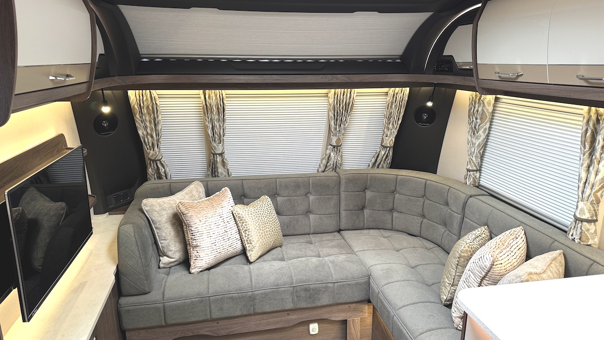For 2025 the nearside front window has made way for a media wall, which accommodates the permanently attached TV that’s included as part of the standard equipment roster. It’s the focal point of the very handsome L-shape lounge, which offers impressive comfort. There are three sumptuous corners to fall into, although four can sit here without too much compromise.