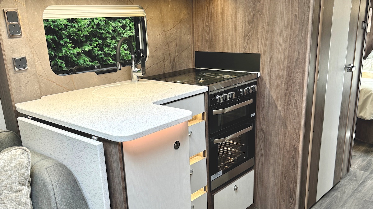 The Laser’s width means there’s enough space to give the kitchen an L-shape flourish, which makes it feel self-contained. Not only does it look good, it lavishes you with the best of everything – a dual-fuel hob with a chunky, cast-iron pan support, a nicely fitted flatbed microwave, a domestic-style extractor fan and an enormous built-in fridge-freezer.