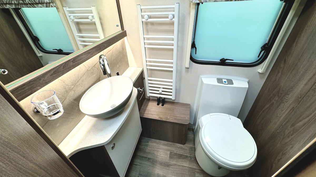 It’s very smartly turned out, with good-quality fittings – and it’s refreshing to find not one but two mirrors. The shower cubicle’s floorspace is interrupted by the intrusion of the wheelarch, but it does make it easy to scrub your toes.