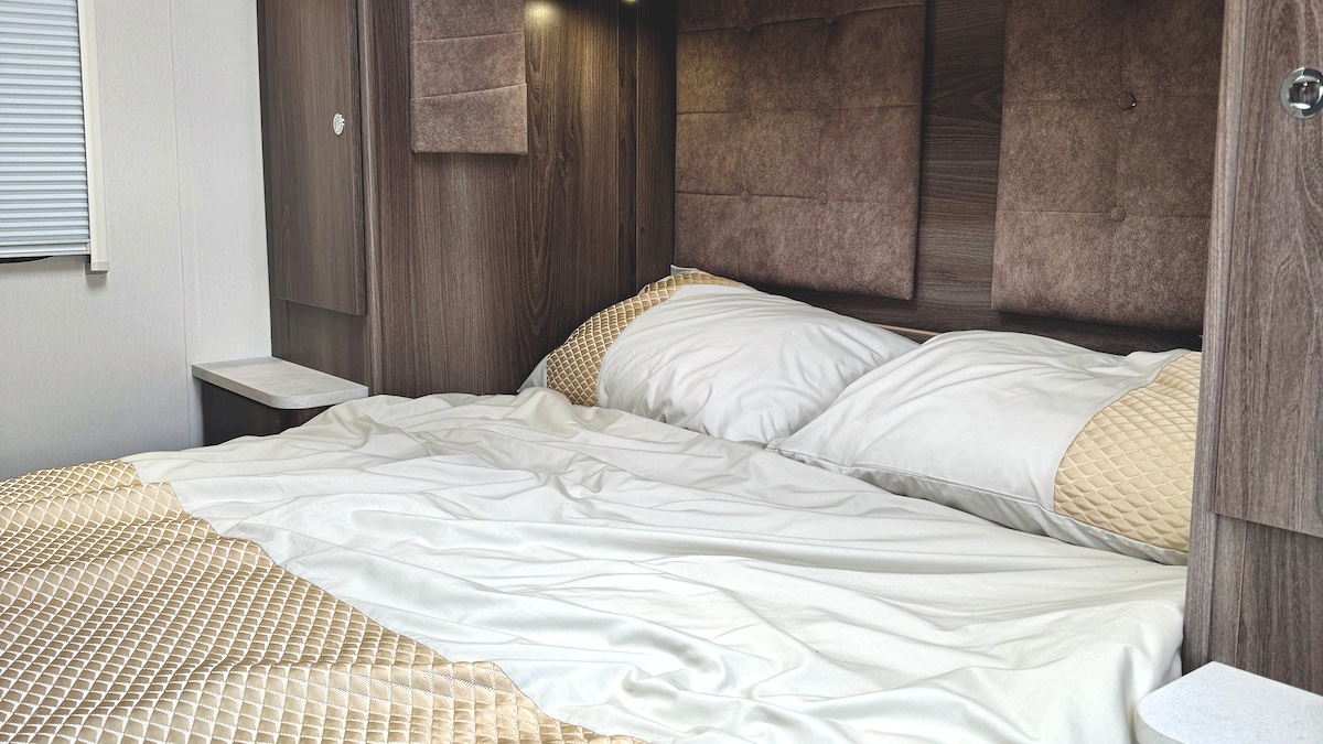It’s a belter of an end bedroom, dominated by the supremely comfortable island double bed. It pushes back into ‘day’ mode to provide a bit more walk-around space – but even when extended to its full 6ft 2in length, there’s still plenty of navigation room.