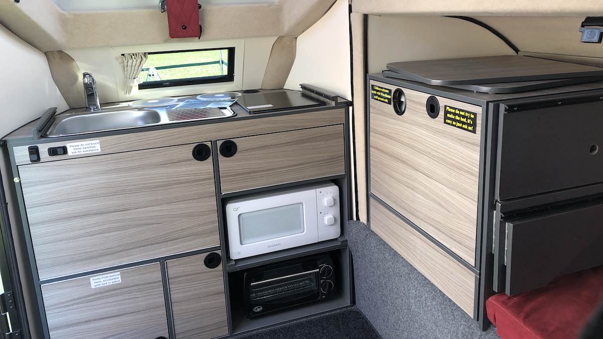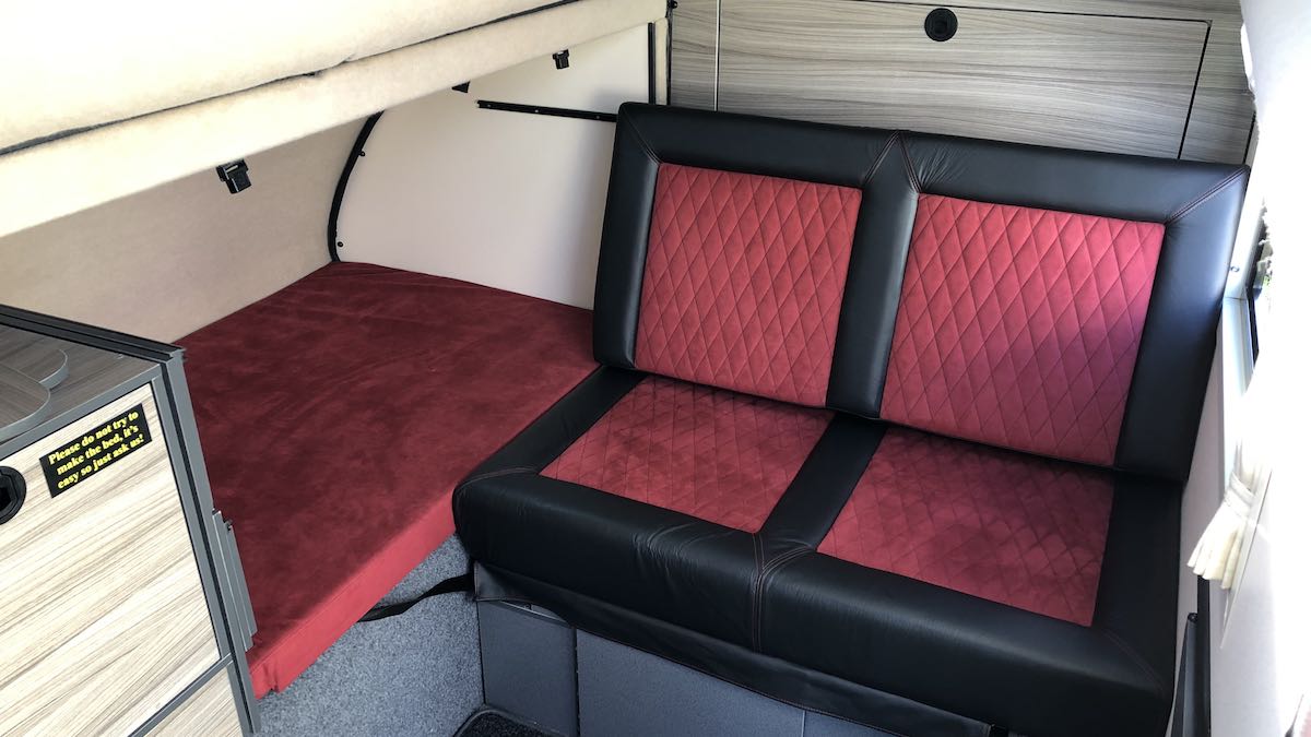Even with the Podrant deployed and the roof raised, there’s only so much living space you can magic up in something as small as this – not everyone could get by with the slightly enclosed ambience of the interior, not helped by having just one little window to look out of when seated. That said, the attractive leather/suede double seat is plush and comfortable, and even with the neat, slide-on tables in place at mealtimes, there’s still enough room for someone to wander (okay, step) over to the fridge to fetch another beer.