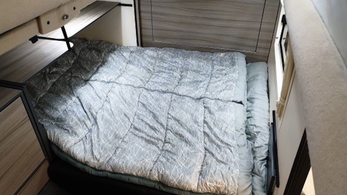 An induction hob in a caravan – that’s certainly a first for me. We do have one at home, though, and the same benefits apply here – ease of cleaning, sleek good looks and adjustability that rivals gas. If you’re using the hob (just one ring) via the inverter, the inverter fan stays on the whole time because of the relatively high power usage involved (the rest of the time, its operation is silent). There’s also a compact microwave and a mini conventional oven/grill. The Waeco compressor fridge is very neatly installed. The sink is served by a cold-water-only tap – with no shower on board, a water heater would add weight and expense for very little benefit.