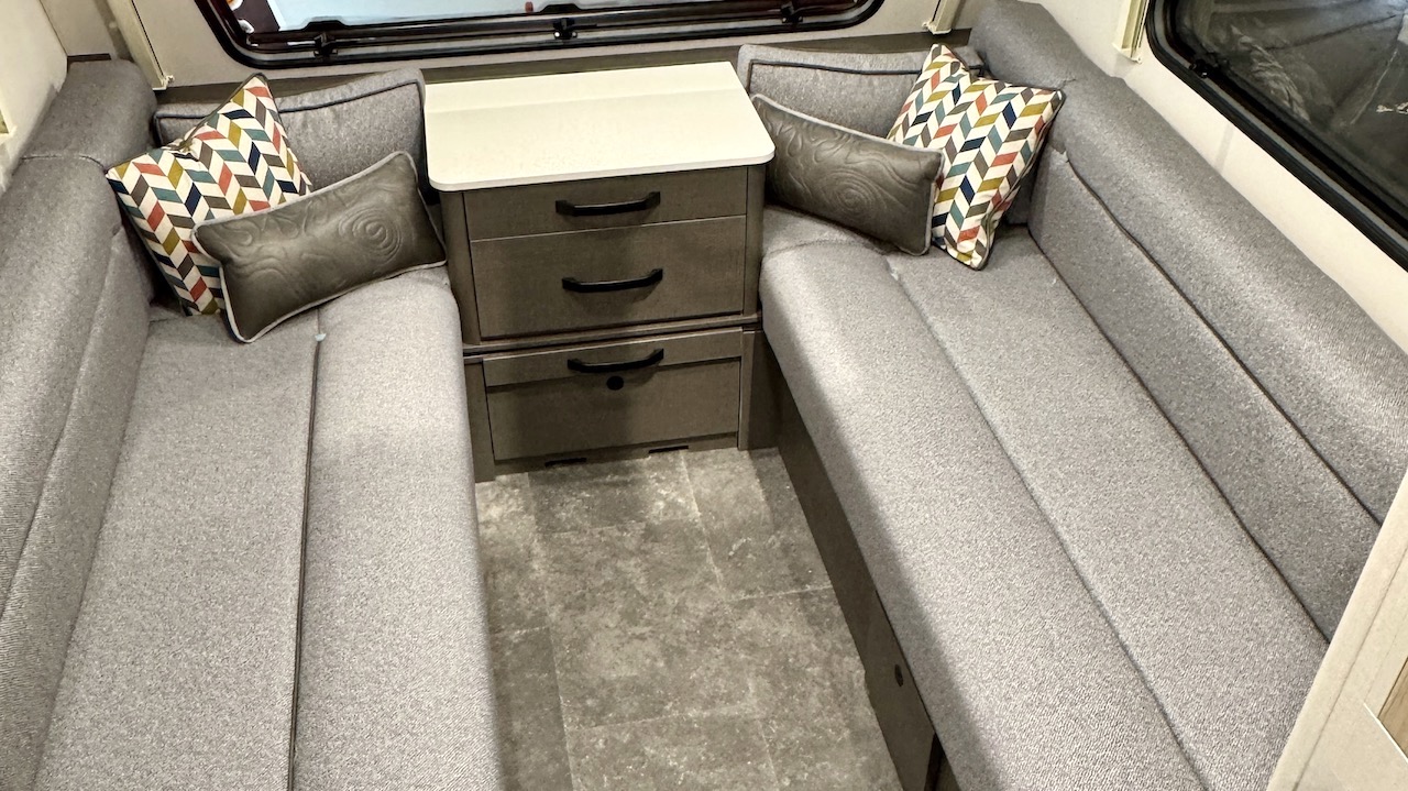 The lounge is served by a pair of powerful, flush-fitting ceiling lamps and an LED strip on the underside of the front overhead lockers, while other ceiling fitments above the wardrobe and outside the washroom ensure a good throughput of illumination. The dresser on the nearside isn’t lit, making that area feel just a tad gloomy – a self-adhesive, battery-powered LED strip on the underside of the locker would provide an effective fix for under a tenner.