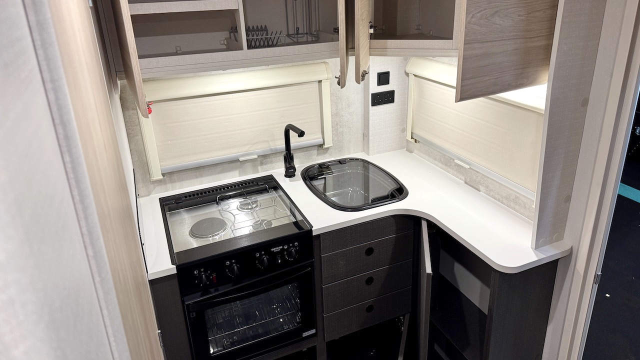 Not only does the L-shaped end kitchen look great, it’s superbly equipped: a dual-fuel hob, a nicely-fitted, low-level microwave, a 98-litre fridge and an Omnivent extractor fan are all standard. Yes, the hob has only three rings – but in 30 or so years of using caravan kitchens, I have never had to use four at once. If you’re cooking outdoors, there’s no need to bring a separate gas supply for the barbie – there’s now a bespoke socket on the nearside sidewall.
