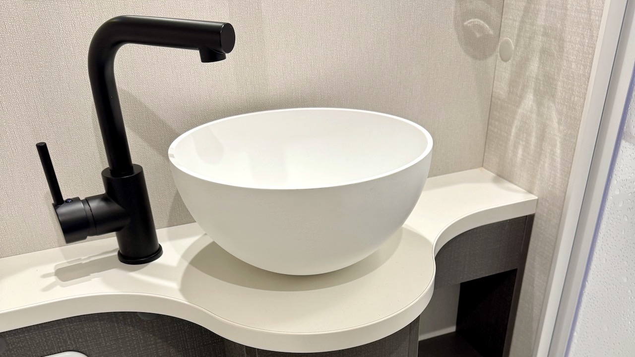 The washroom is a truly excellent facility, not least because you get a separate full-sized shower cubicle within the modest floorspace; as elsewhere in the caravan, there’s a pleasant sense of spaciousness in here that actually comes as a bit of a surprise when you open the door for the first time. The black fittings are robust and lend an air of modernity, while the usefully-long mirror and very good storage options – two lockers and some open shelving – are welcome practical touches.