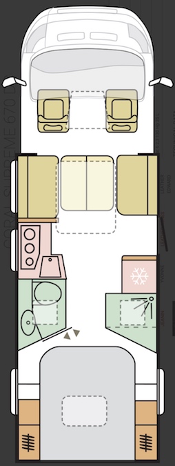 Fiat’s sure-footed Ducato underpins the Coral 670 DC and the upgrade to a 150bhp engine here (standard size is 130bhp) improves the overall driving experience.